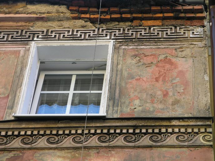 Druga dzielnica, którą miałam okazję obejrzeć to śródmieście. Przeważa tu zabudowa XIX-wieczna, ale najstarsze kamienice pochodzą z drugiej ćwierci XVIII w. Tu właśnie najbardziej widać rozbieżność między zadbanym odnowionym rynkiem, a raczej fatalnie wyglądającymi budynkami na sąsiednich ulicach (ba! Wystarczy wejść w podwórko przyrynkowej kamienicy :wink_tb:. Ale detale pozwalają snuć przypuszczenia jakie cudeńka tu się kryją. Gzymsy, pilastry, obramienia okien, portale wejściowe, szczyty – choć często szare i przybrudzone mają bardzo rozmaite kształty i formy. I moja słabość – metaloplastyka; zasadniczo w nienajgorszym stanie ( czyt. jeszcze jej rdza nie przeżarła), ale domagająca się raczej szybkiej interwencji. To przede wszystkim barierki balkonów i ozdobne kraty osłaniające szyby w drzwiach wejściowych. Ale też drobne elementy, takie jak klamki, latarnie, ‘gniazdka’ podtrzymujące trakcję elektryczną czy uchwyty na flagi. Niewielkie przedmioty o niebanalnym wyglądzie i bardzo starannym wykonaniu. Aż żal, że dziś co raz rzadziej się je spotyka, zazwyczaj zastąpione masowym, prostym i mało eleganckim produktem XXI wieku.