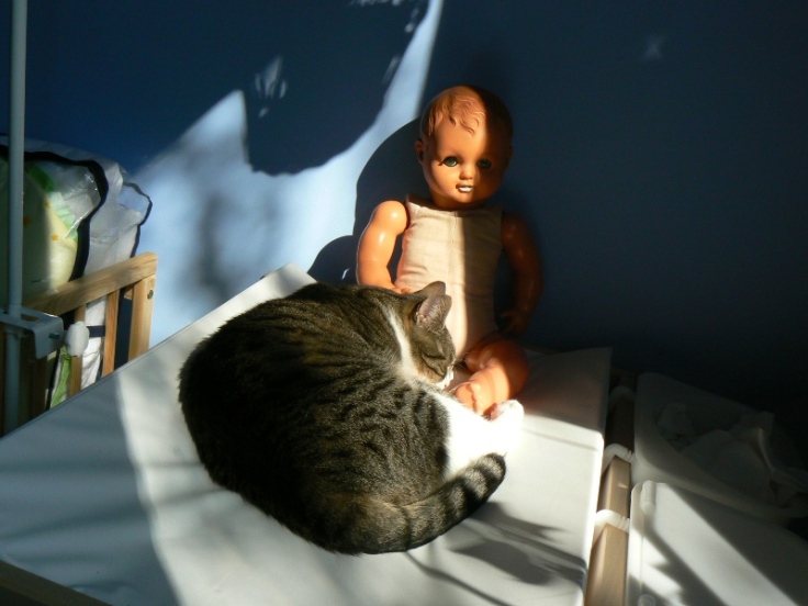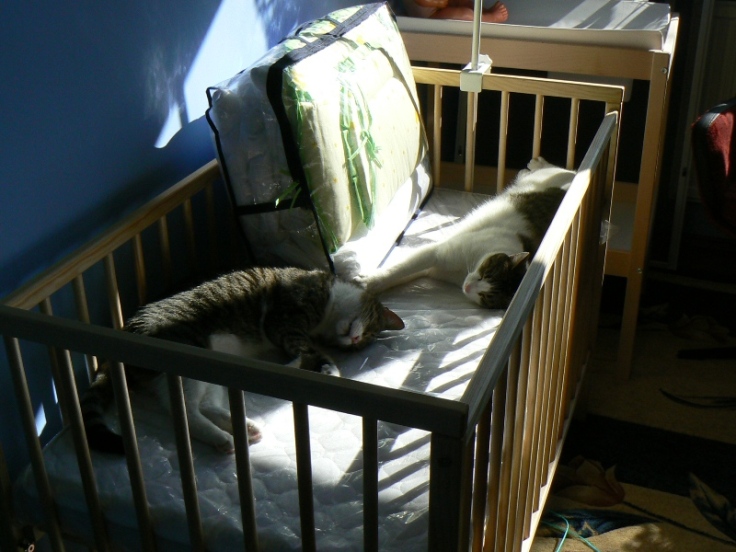Na pierwszy ogień poszło łóżeczko. Z miękkim materacem, perfekcyjnie ustawione w słonecznej plamie. Na podwyższeniu, tak że nie grozi nadepnięcie/potrącenie przez jakiegoś nieuważnego człowieka. Raj na ziemi, z którego trudno będzie im zrezygnować (właściwie, to nie wiadomo czy w ogóle z tego zrezygnują – czy ktoś ma pomysł jak w jednym łóżeczku zmieścić niemowlę i dwa koty?).