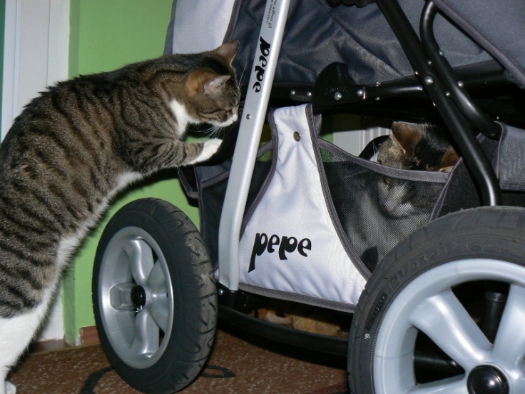 Potem pojawił się materacyk do przewijania i wózek. Materacyk trochę mniejszy od łóżeczka, ale jeden kot się zmieści ;-). Za to wózek to dopiero atrakcja! Można ukryć się w koszu, choć wpierw trzeba pokonać brata w wyścigu o pierwszeństwo wstępu. Można też posiedzieć w spacerówce. Ale najwygodniej chyba pospać na/w gondolce.